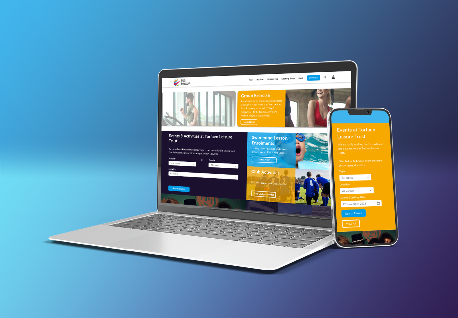 Website designed for Torfaen Lesiure Trust using their existing brand colours allowing them to move away from an old CRM that had an outdated look. Design also included the ability to book classes online via the web which is a feature that they previously lacked.